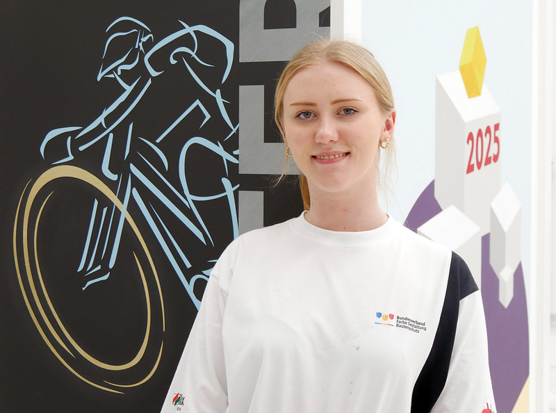 Mit einer überzeugenden Gesamtleistung setzte sich Isabell Masannek, 22, aus Rietberg in Nordrhein-Westfalen durch und holte den Titel „Deutsche Meisterin der Maler und Lackierer 2025“. Der zweite Platz ging an den 20-jährigen Richard Barsch aus Sachsen, Platz 3 belegte der 19-jährige Jonas Schneegans aus Niedersachsen. Den Sonderpreis „Die gute Form“ für ihr besonderes Gestaltungskonzept gewann Isabell Masannek. Ihr ansprechendes Design mit Goldapplikation zeigte einen Fahrradfahrer in hellblau vor dunklem Hintergrund sowie den Schriftzug „Münster“, passend zum Austragungsort der Deutschen Meisterschaft.